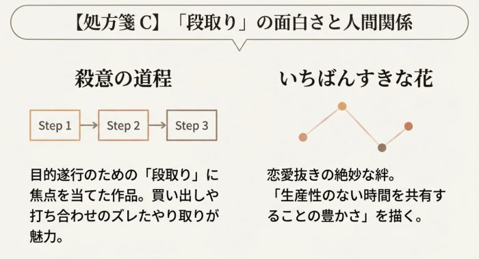 復讐を誓った男二人が完全犯罪を計画する過程を描きますが、焦点は「殺害」ではなく、その準備段階の「買い出し」や「打ち合わせ」に置かれています。