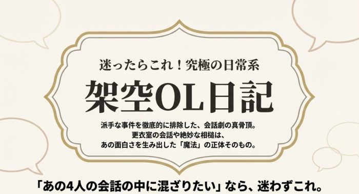 もしあなたが、ブラッシュアップライフの「あの4人の会話の中に混ざりたい」という気持ちで作品を探しているなら、迷わず 架空OL日記 を選んでください。