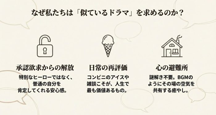 - 承認欲求からの解放:特別なヒーローではなく、普通の自分を肯定してくれる安心感。