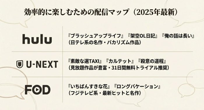 「何気ない一言が後から大きな意味を持つ」伏線回収の鮮やかさと、30代男女の緩やかな連帯感が、ブラッシュアップライフの大人版とも言える深みを持っています。 - 視聴可能なVOD: U-NEXT(見放題)、Hulu、amazonプライムビデオ