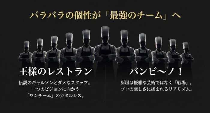 一人ひとりの個性を活かし、最強のチームを作り上げていく過程は、グランメゾン東京のチーム集め(RPG的なワクワク感)に通じます。