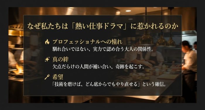 私たちが「グランメゾン東京」のような作品を求めてしまうのは、単に美味しそうな料理が見たいからではありません。