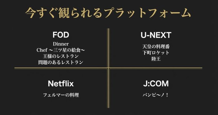 あの興奮をもう一度味わいたい方のために、VODで今すぐ観られる「グランメゾン東京に似た熱量を持つ傑作ドラマ」を厳選してご紹介します。