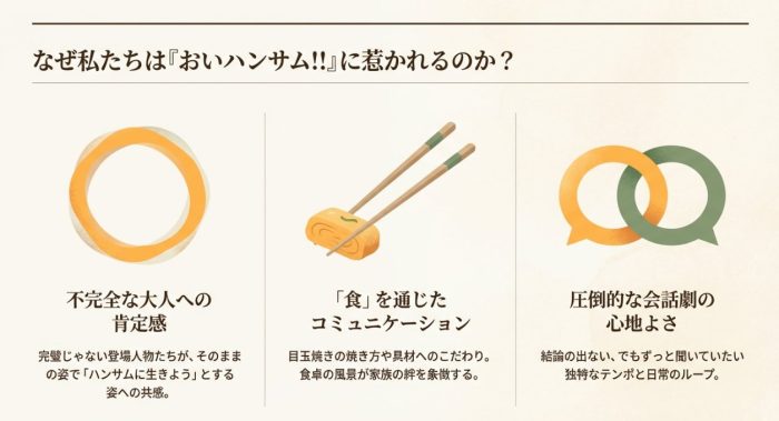 • 不完全な大人への肯定感: 偉そうだけどどこかズレている父・源太郎や、恋愛に迷走する三姉妹。完璧じゃない登場人物たちが、そのままの姿で「ハンサムに生きよう」とする姿に救われるからです。