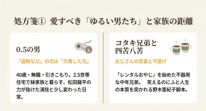 • ココが似ている!: おいハンサム!!が「過剰な父」の物語なら、こちらは「欠落した兄」の物語。しかし、家族というシステムの中に「少し変わった存在」がいることで、日常が鮮やかに彩られていく温度感はそっくりです。松田龍平の力が抜けた演技が、源太郎とはまた違う癒やしを与えてくれます。