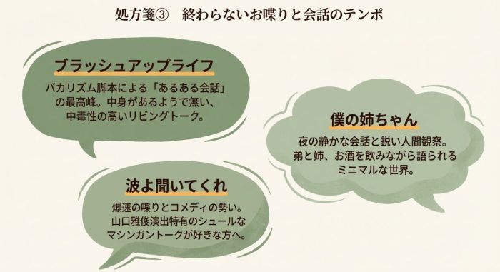 • ココが似ている!: バカリズム脚本による、凄まじい解像度の「あるある会話」が魅力。おいハンサム!!の三姉妹がリビングで繰り広げる、あの中身があるようでない、中毒性の高いお喋りを求めているならこの作品一択です。