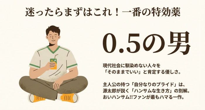 おいハンサム!!と同じく、現代の日本社会に少しだけ馴染めない人々を、最高にチャーミングに、そして「そのままでいいんだよ」と肯定してくれるからです。松田龍平演じる主人公の「自分なりのプライド」は、源太郎が説く「ハンサムな生き方」の別解のようにも見えます。