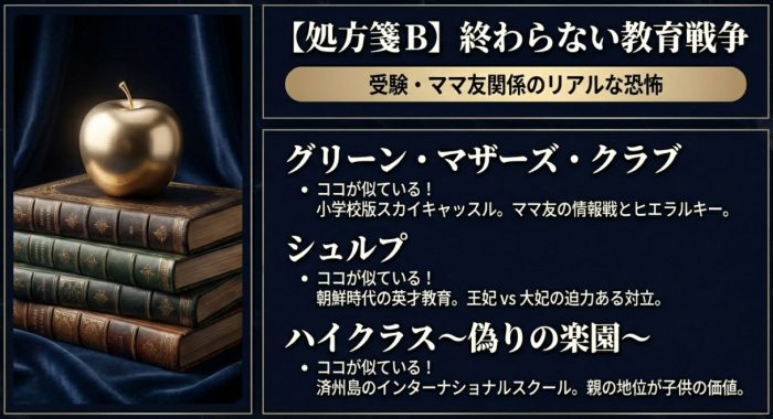 韓国の教育特区を舞台に、小学生の子供を持つ5人の母親たちの葛藤を描きます。大学入試よりも逃げ場がない、ママ友コミュニティの息苦しさを徹底的にリアルに描写しています。