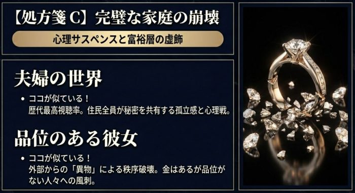 スカイキャッスルが持つ歴代最高視聴率記録を塗り替えた金字塔。不倫から始まる物語ですが、その本質は「富裕層コミュニティの虚飾」と「子供を巡る親のエゴ」にあります。