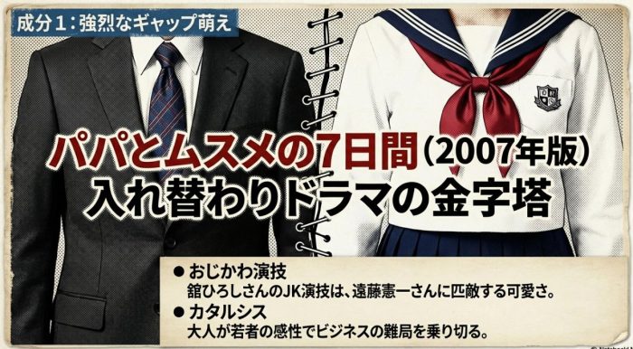 - あらすじ: 冴えないサラリーマンの父と、思春期の娘がある日突然入れ替わってしまう。父(中身は娘)は会社で女子高生言葉を連発し、娘(中身は父)は憧れの先輩とのデートに戸惑いながら奮闘する。
