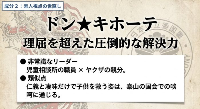 - 素人視点での世直し: 政治の素人が、純粋な正論で腐敗した権力構造をぶち壊していく爽快感。