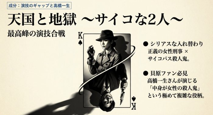 入れ替わりドラマの完成形であり、民王が好きなら間違いなく満足できる「おじさん俳優のギャップ」が楽しめます。また、高橋一生さんのファンであれば、少しシリアス寄りですが 天国と地獄 〜サイコな2人〜 での彼の圧巻の演技は避けて通れません。