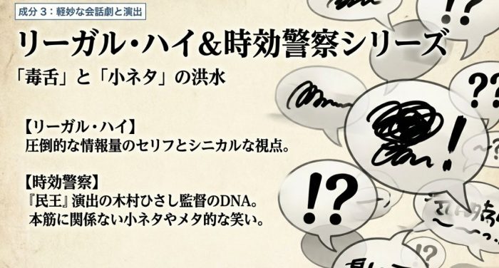 - ココが似ている!: 民王の演出を手がけた木村ひさし監督のDNAとも言える、背景の小ネタやメタ的な笑いが満載です。物語の本筋に関係ない部分で笑いを誘う、深夜ドラマ特有の遊び心が詰まっています。