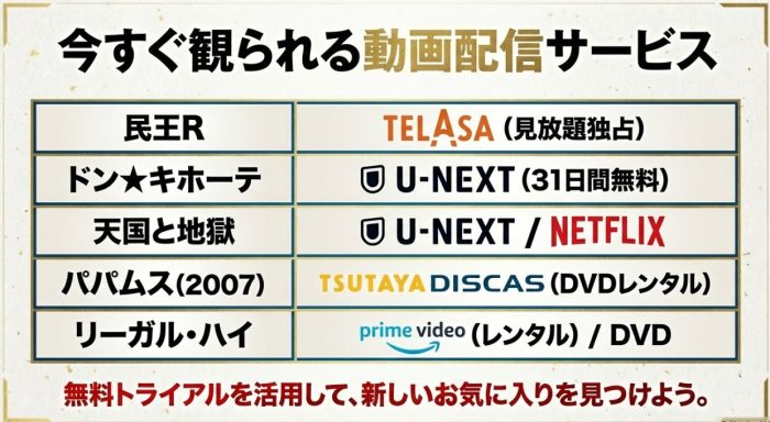 - 視聴可能なサービス: U-NEXT(無料トライアルあり)